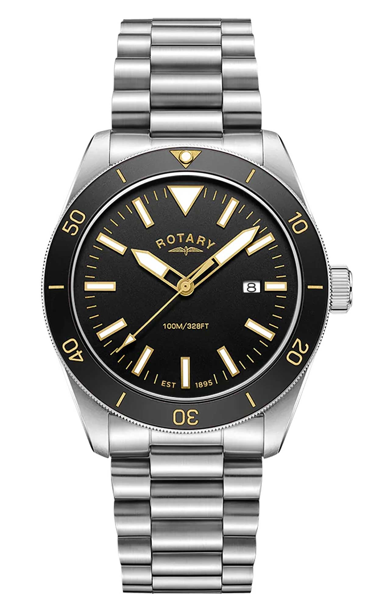 Drawing inspiration from the classic designs of early sport watches, the Rotary Apex100 honours Rotary's legacy of precision and durability. Its stainless steel case, paired with a matching 3-link bracelet, delivers a rugged dive watch style, enhanced with a contrasting red uni-directional bezel. The black dial with lumi-nova hands and indices, ensures clear legibility. Featuring a quartz 3-hand movement that perfectly aligns with its highly-functional design.