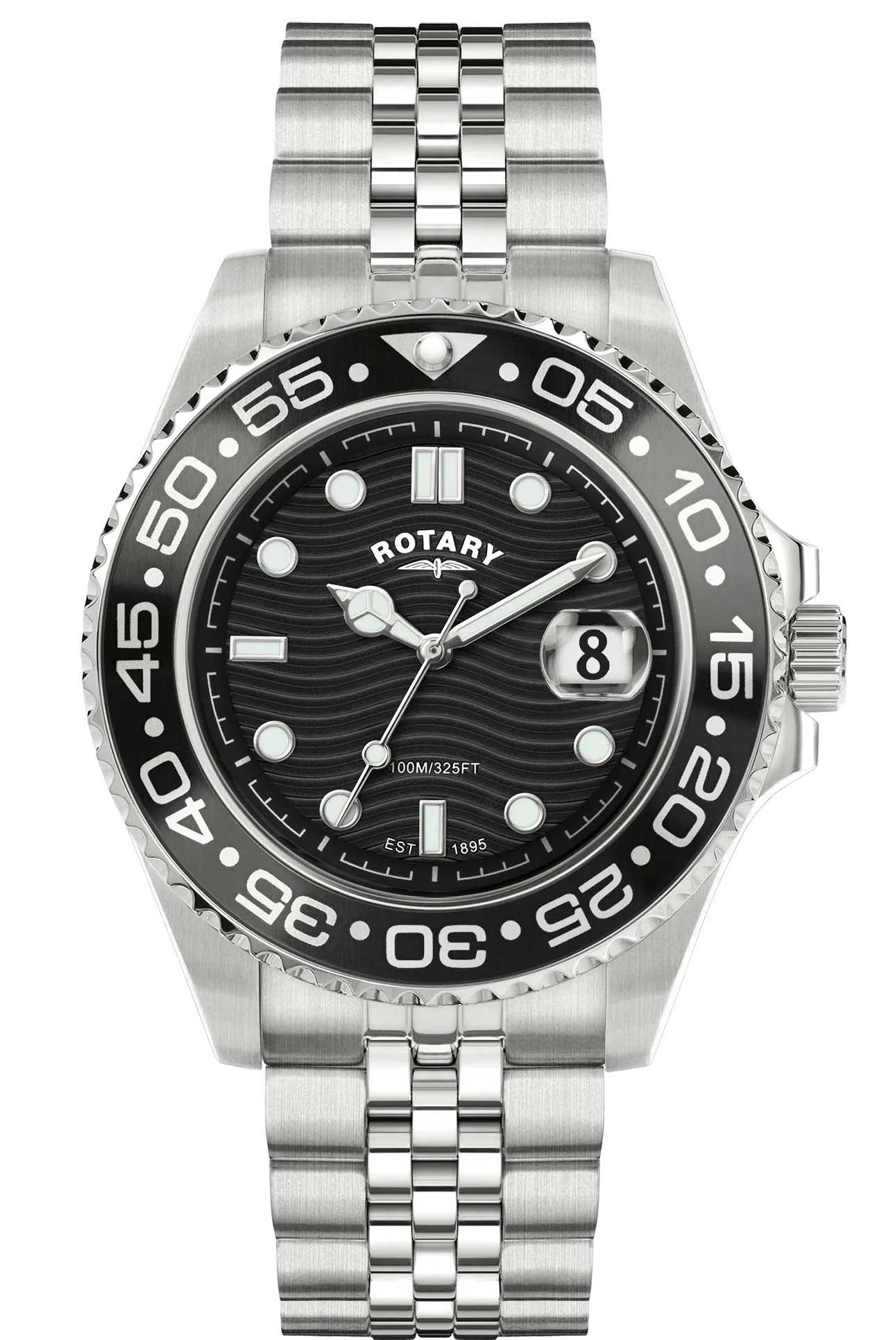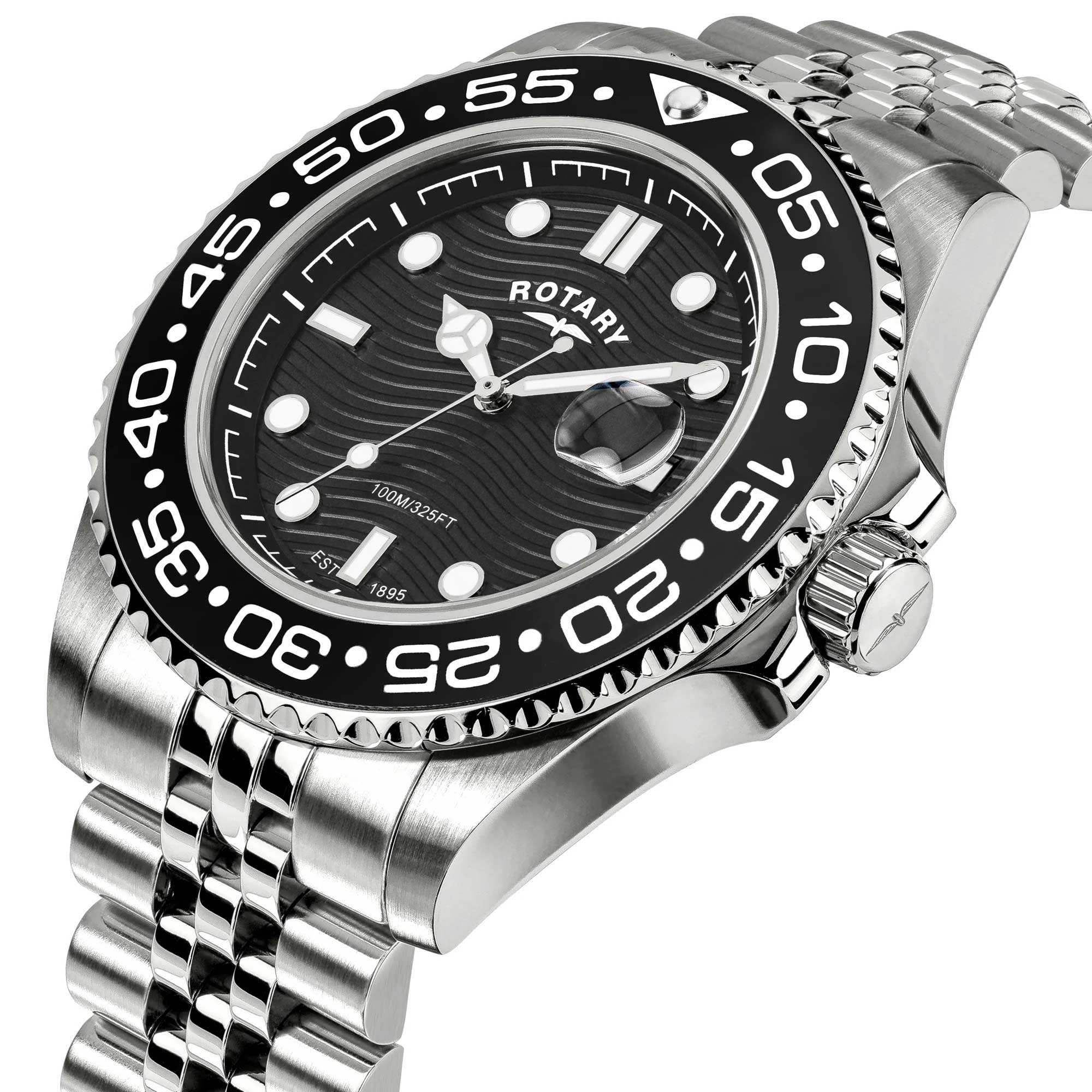 The Rotary Apex100 Diver blends classic sports watch design with modern, robust watchmaking. From its bold unidirectional bezel and date magnifier to the subtle wave-textured black dial, it showcases hallmark elements of a true sports watch.