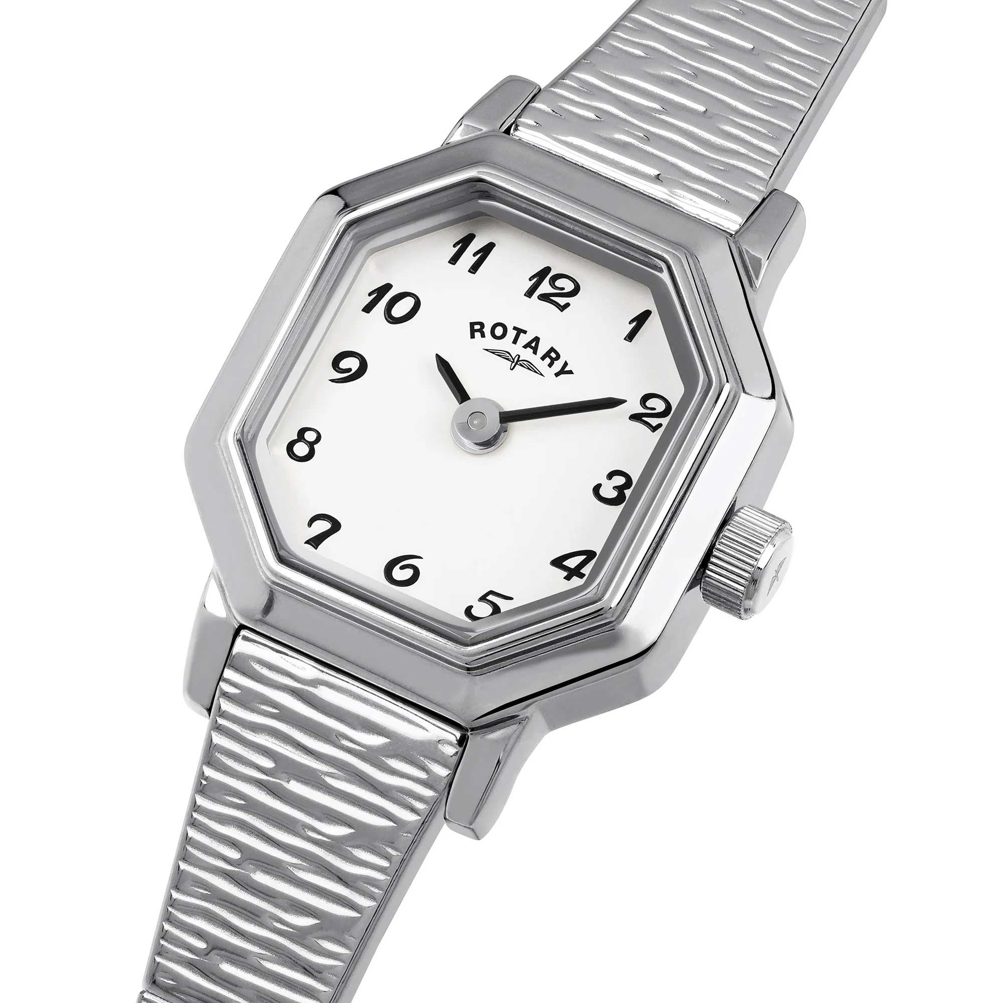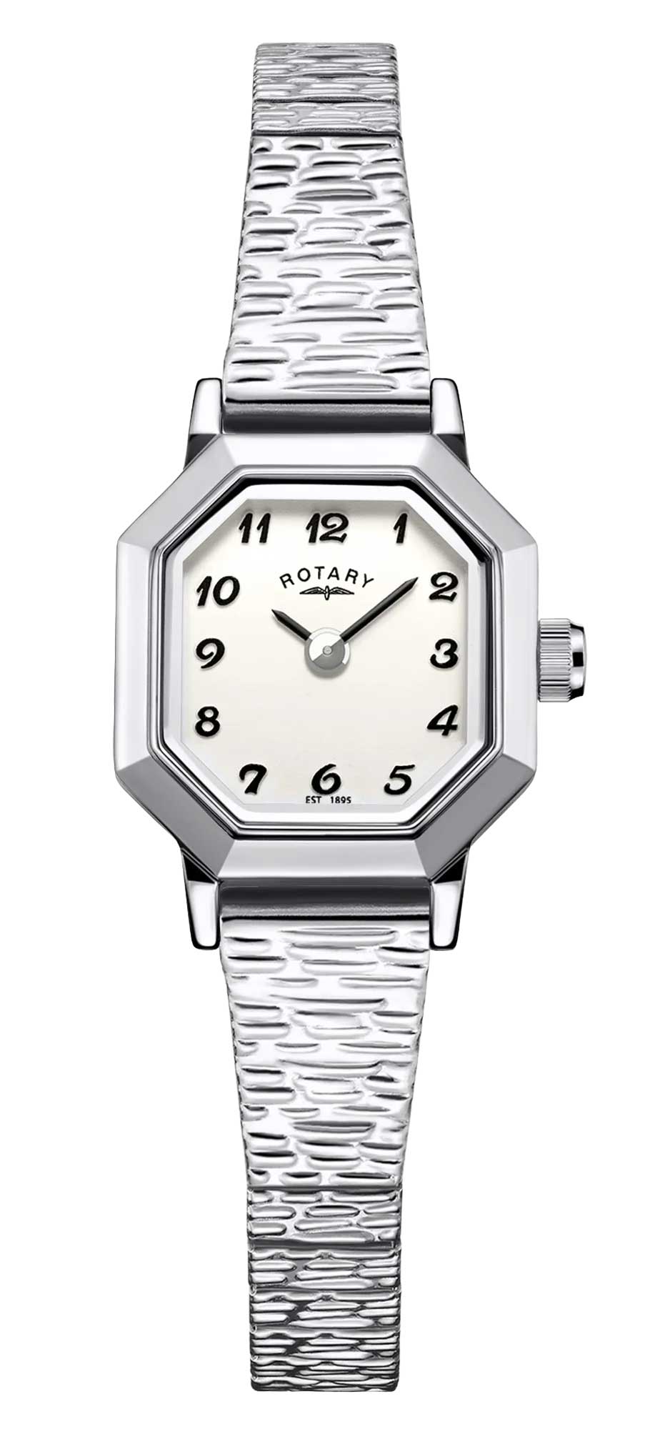 The Rotary Heritage Altera delivers a clean, integrated design with wearability at the core of the design. Featuring an expanding bracelet, this watch comfortably fits without the need for resizing the bracelet. The stainless steel octagonal 17.5mm case houses a quartz movement and is protected by mineral glass. The white dial features applied black numerals and two black hands.