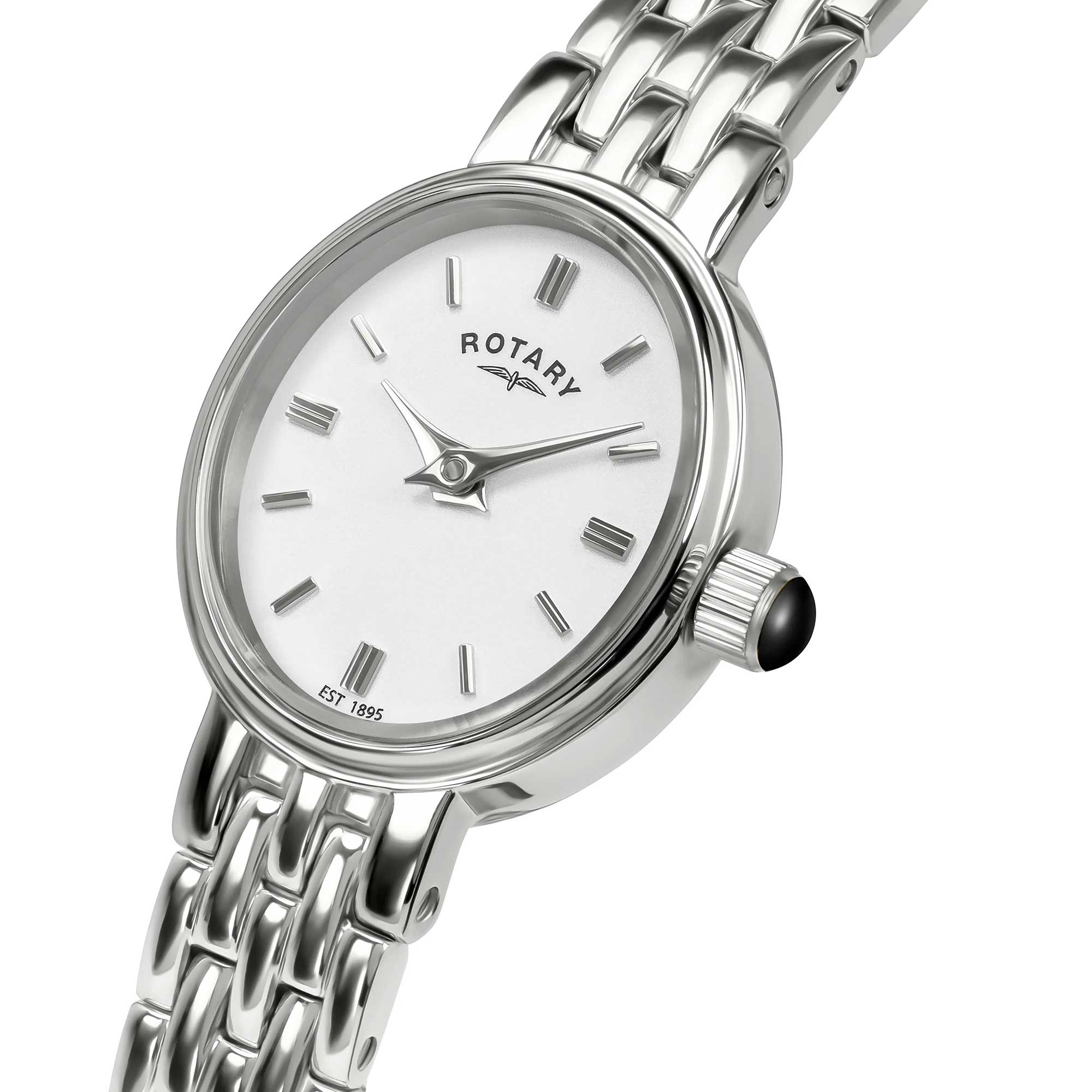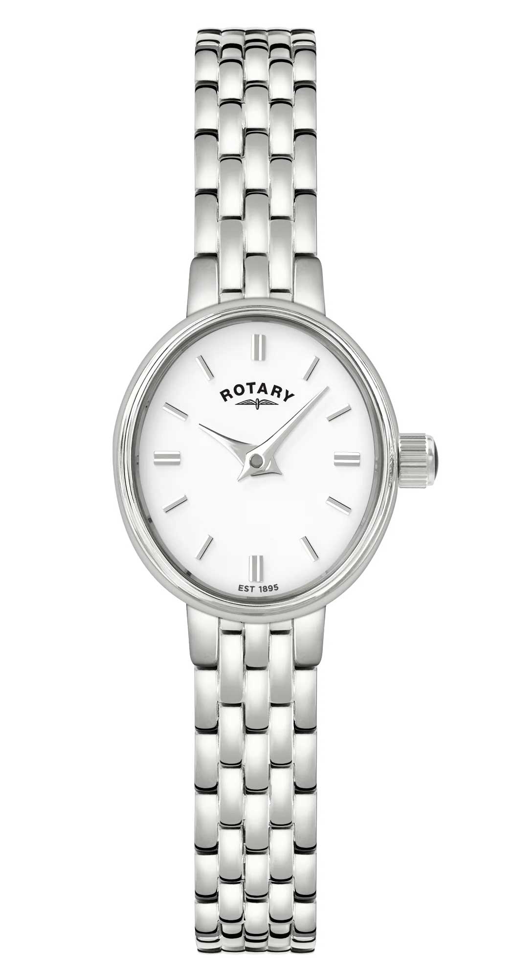 The Rotary Cocktail, a delicate ladies' watch that epitomizes elegance and refinement. The petite 18mm stainless steel case embraces a white dial.